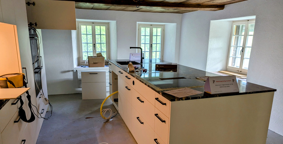 Bevor die Küche eingebaut werden konnte, wurden die Böden inklusive Bodenheizung eingebaut, die Wände abgerieben und gestrichen, eine Innenwand gemauert und diverse Elektroinstallationen gemacht. Zudem wurde der bestehende Kellerabgang erneuert.