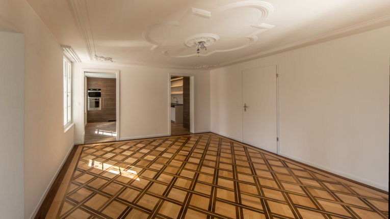 Der Ausbaustandard war deshalb hoch angedacht, Parkett wie Stuckdecken sollten erhalten werden. Insbesondere jedoch Küche und Nasszellen galt es auf einen zeitgemässen und sehr guten Stand zu bringen.